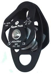 MINIMAX - POLIA DUPLA LATERAL - ROLAMENTADA – Polia dupla lateral para cordas com até 12mm de diâmetro. Placas laterais oscilantes e engates para mosquetões nos dois lados (abaixo e acima das roldanas). Placas laterais em duralumínio anodizado e roldanas em alumínio polido. Resistência à ruptura de 28KN e carga máxima de utilização recomendada de 560kg. Em conformidade com a norma europeia EN12278. |